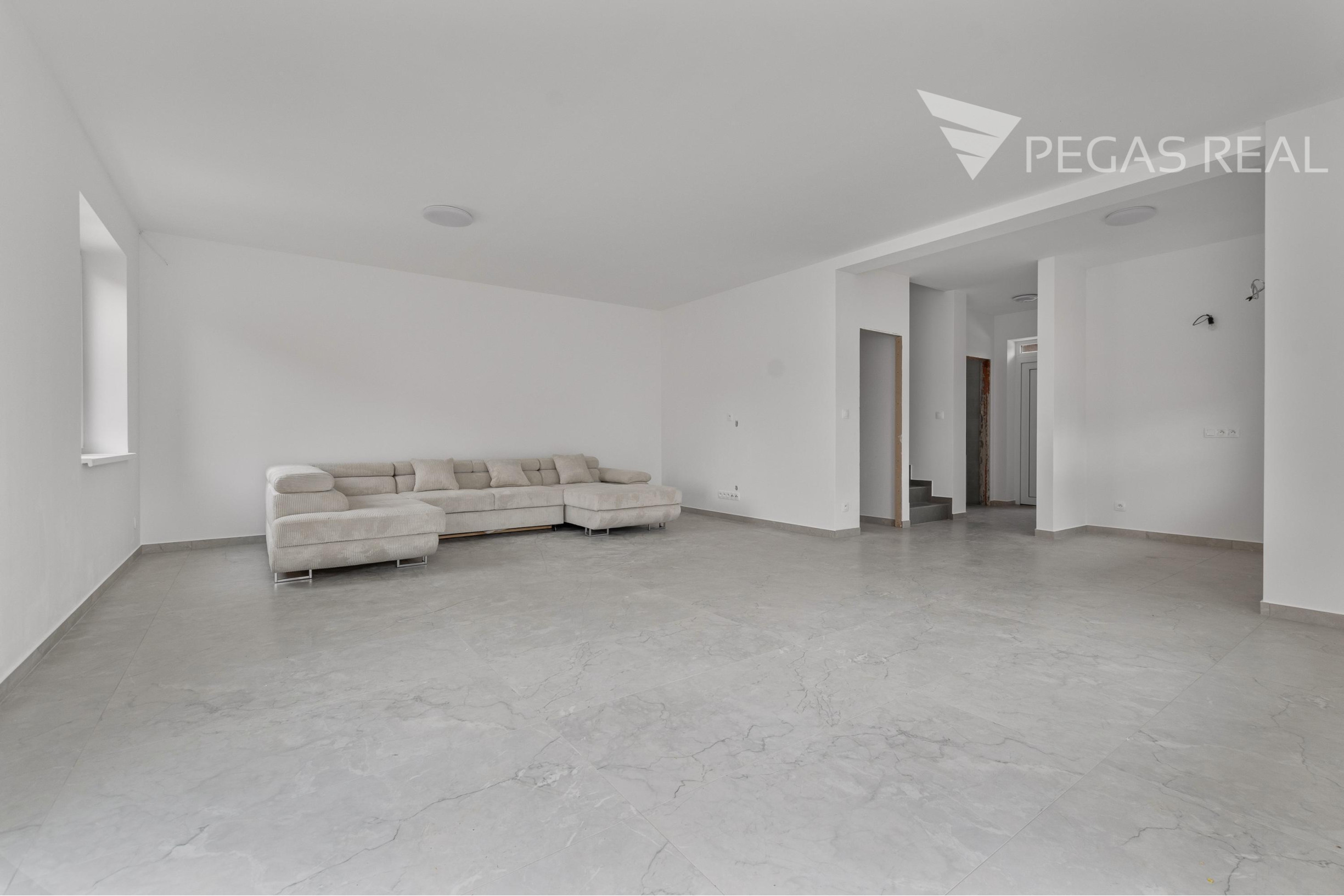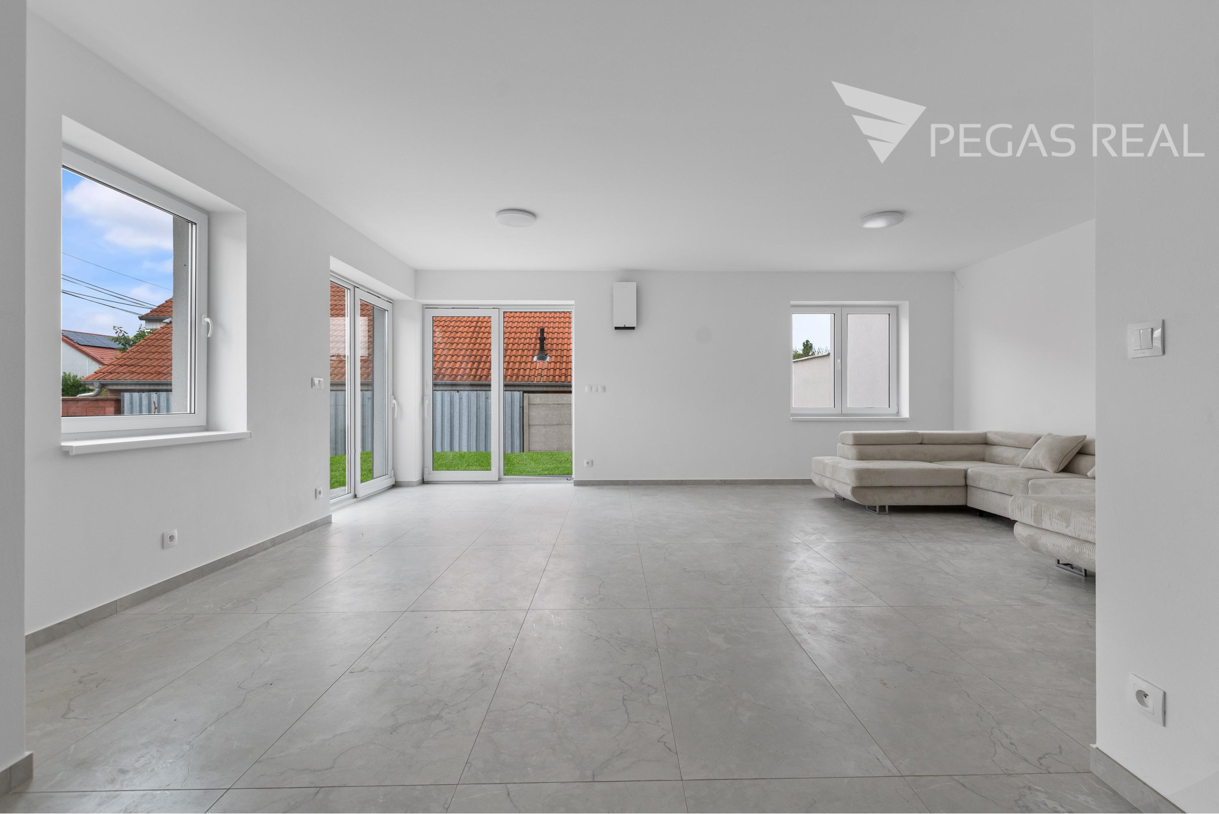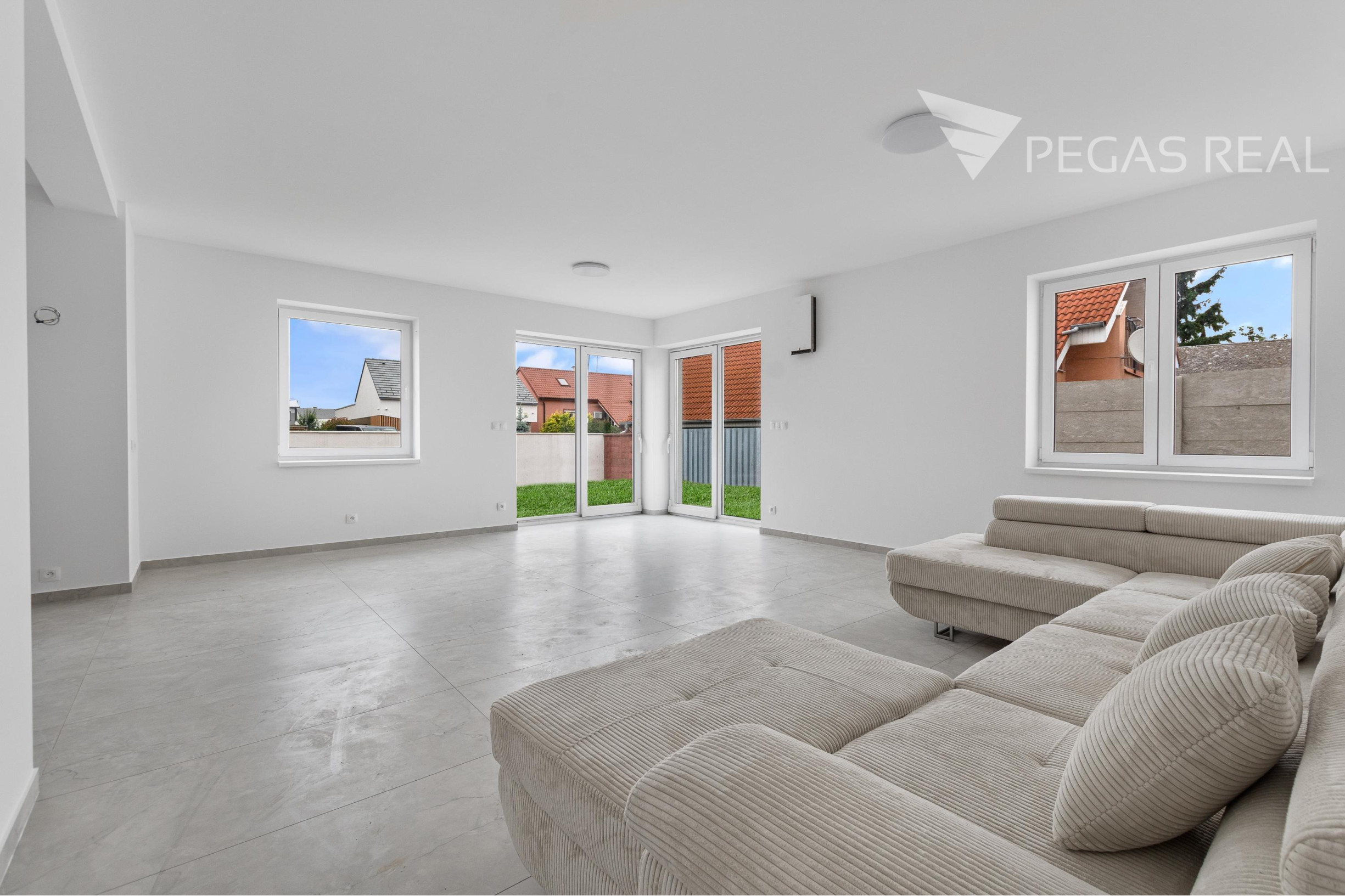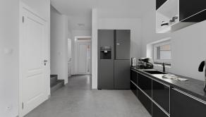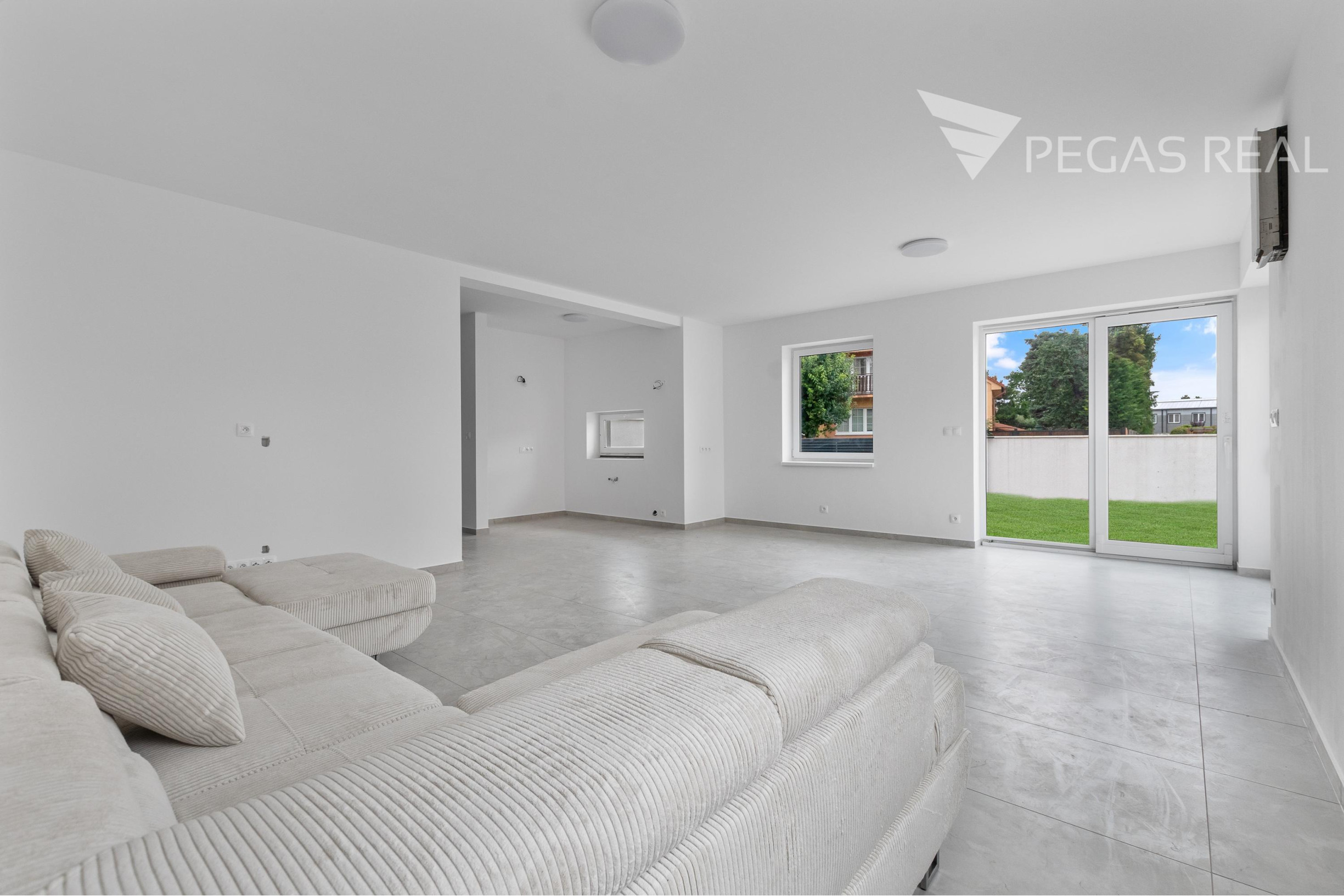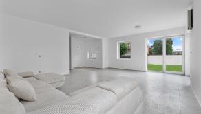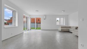 -veľká obývacia izba s veľkými francúzkymi oknami s priamym výstupom do záhradnej časti, ktorá je spojená s kuchynskou časťou