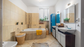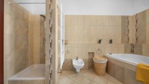 - kúpelňa so sprchovým kútom, vaňou, bidetom a oknom