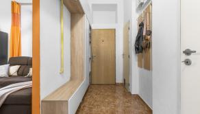 Do bytu sa vstupuje cez chodbu s prechodom do obývacej izby spojenej spojenej s kuchyňou. Kuchyňa je menšia ale komplet vvybavená. Je tu chladnička, umývačka, varná plynová doska a digestor.