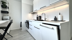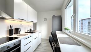 nové zariadenie a nábytok v celom byte - moderná kuchyňa s novými spotrebičmi (indukčná varná doska, elektrická rúra, umývačka riadu, chladnička s mrazničkou, mikrovlnka, rýchlovarná konvica, práčka)