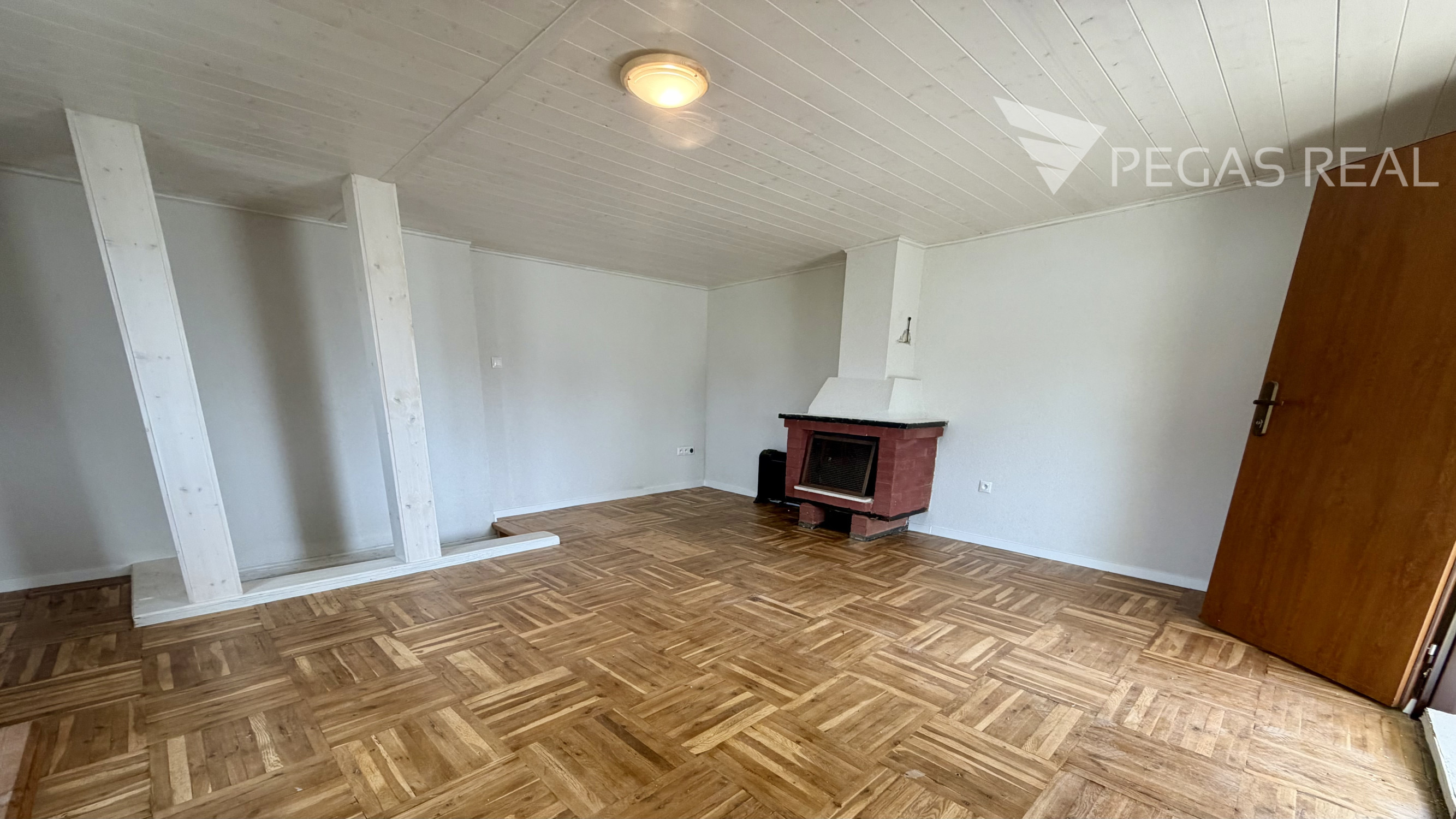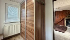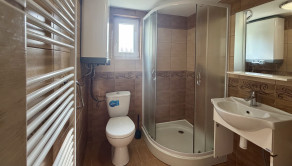 Dispozícia: vstupná hala s vchodom do obývačky a do kúpeľne. Obývačka s krbom je voľne prepojená s kuchyňou, čo tvorí pekný veľký denný priestor chaty presvetlený denným svetlom. Na prízemí sa ešte nachádza menšia izba. Schodiskom sa dostávame na poschodie, kde je situovaná jedna veľká miestnosť s terasou orientovanou na juh.