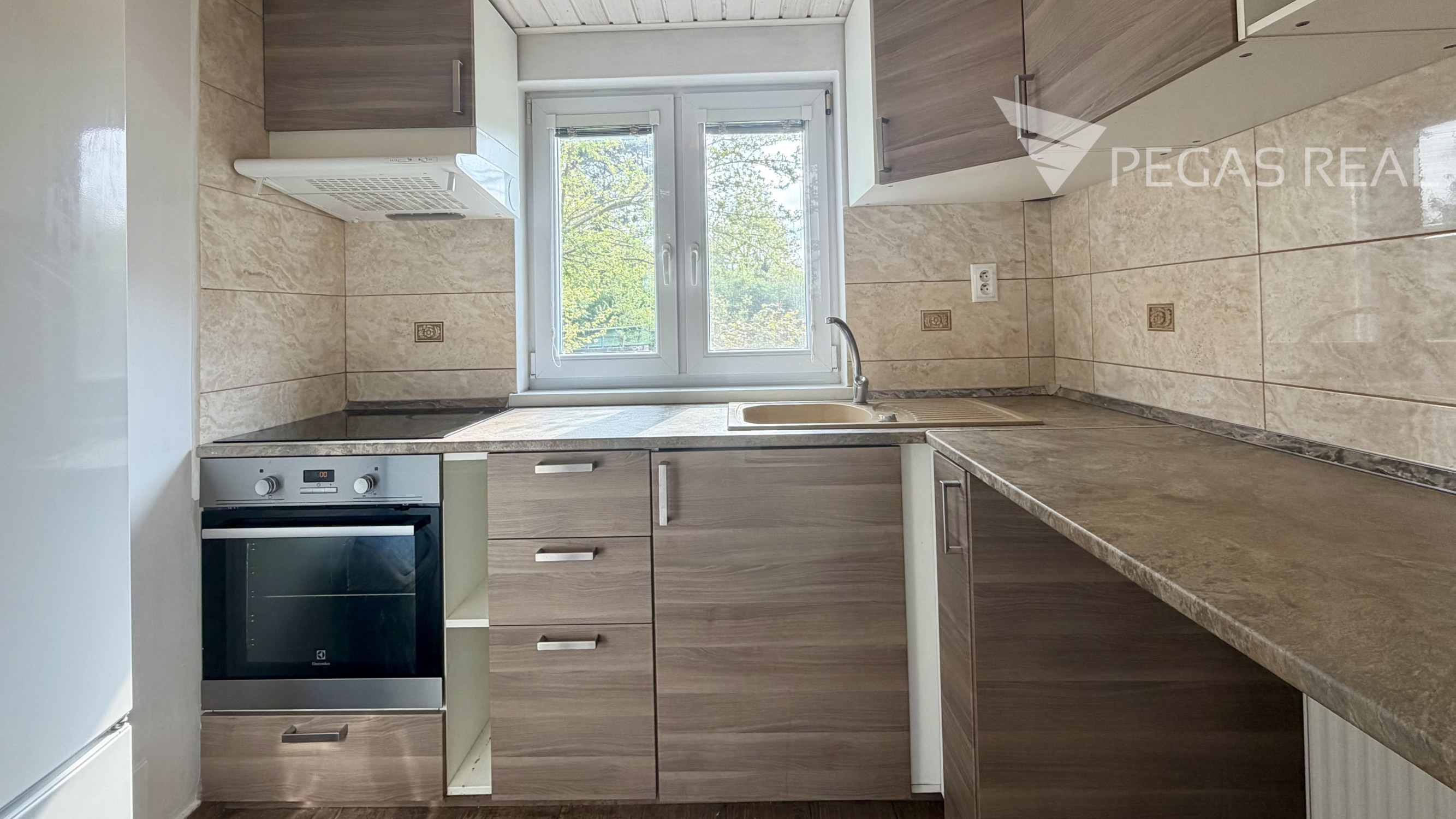 Kuchynská linka vyhotovená na mieru je so vstavanými spotrebičmi – elektrická varná doska, elektrická rúra, drez s batériou, chladnička s mrazničkou.